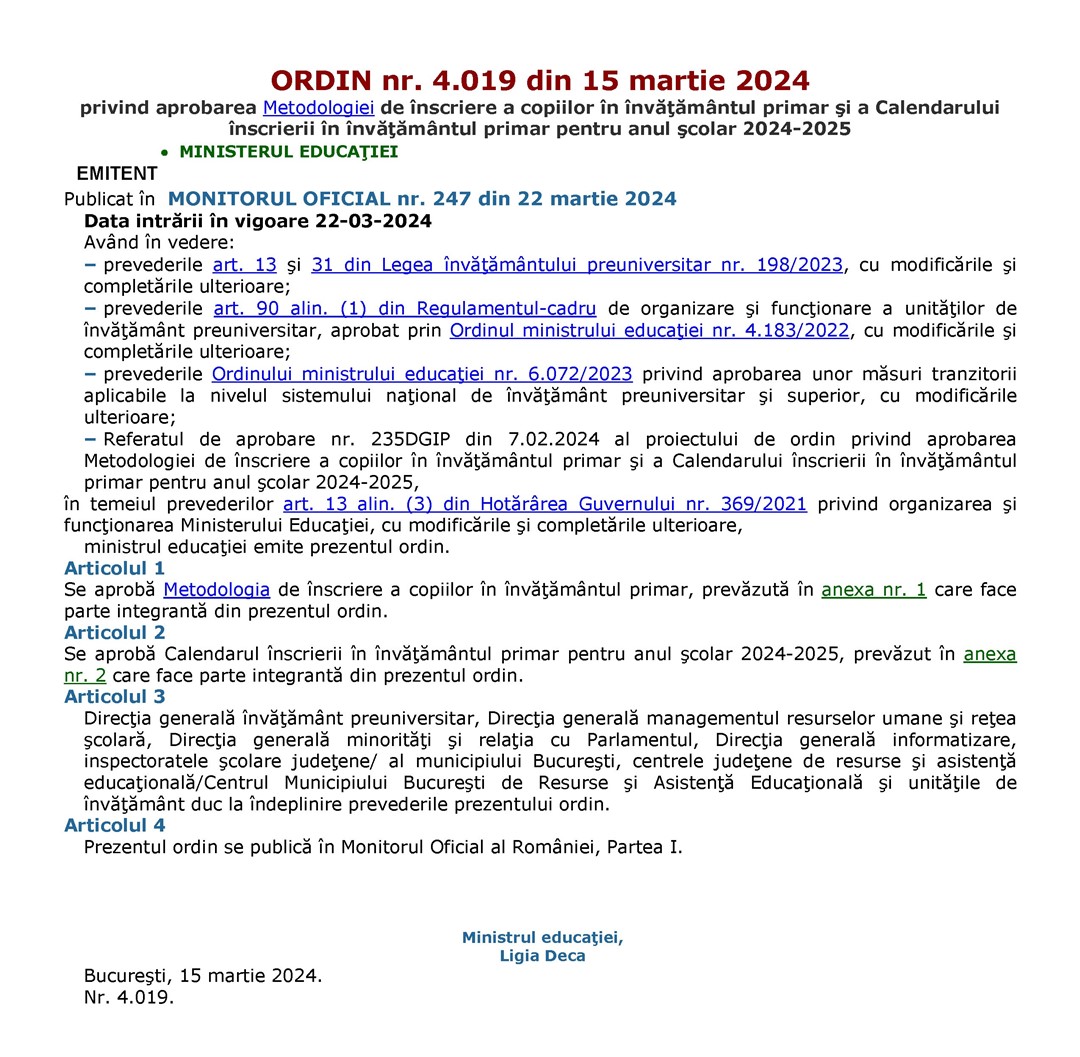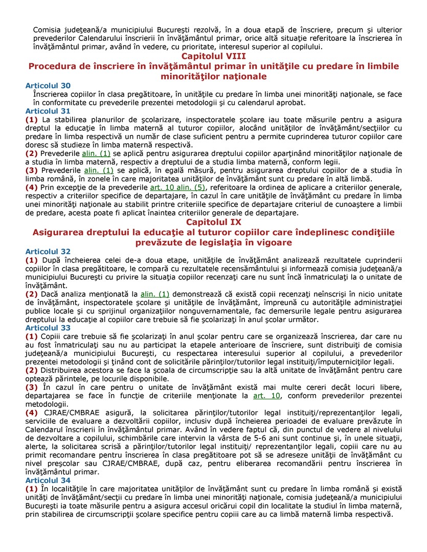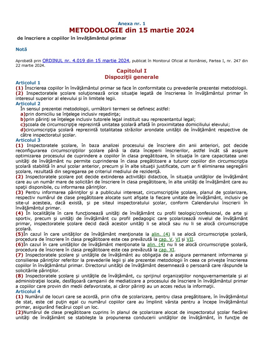 În acord cu prevederile O.M.E. nr. 4019 din 15.03.2025 privind aprobarea Metodologiei de înscriere a copiilor în învățământul primar, valabil și pentru înscrierea copiilor în învățământul primar pentru anul școlar 2025 - 2026, art. 34, alineatul (1) - „În localitățile în care majoritatea unităților de învățământ sunt cu predare în limba română și există unități de învățământ/secții cu predare în limba unei minorități naționale, comisia județeană/a municipiului București ia toate măsurile pentru a asigura accesul oricărui copil din localitate la studiul în limba maternă, prin stabilirea de circumscripții școlare specifice pentru copiii care au ca limbă maternă limba respectivă. (2) Dacă în localitățile menționate la alin. (1) există un număr mic de unități de învățământ cu predare în limba unei minorități, atunci inspectoratele școlare respective pot decide să nu aloce circumscripții școlare pentru aceste unități de învățământ. În acest caz, părinții copiilor care au ca limbă maternă limba minorității respective pot solicita înscrierea la oricare dintre unitățile de învățământ cu predare în limba respectivă.”